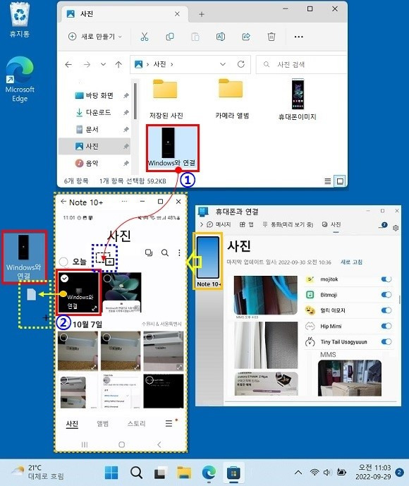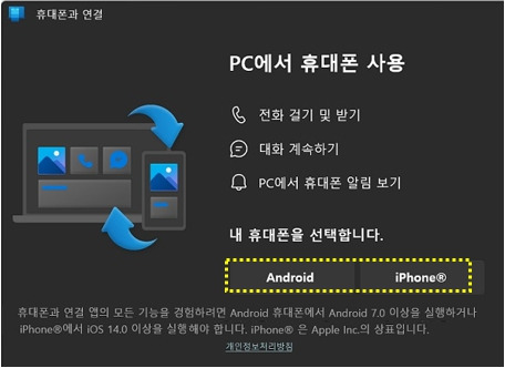 - PC와 스마트폰 연결 : PC에서 '휴대폰과 연결' 앱을 실행한 후, 스마트폰에서 앱을 열고 QR 코드를 스캔하거나 Microsoft 계정으로 로그인하여 연결합니다.