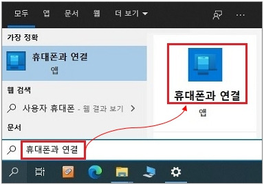 - '휴대폰과 연결' 검색 : 검색창에 '휴대폰과 연결'이라고 입력하고, 나타나는 앱을 클릭하여 설치합니다.