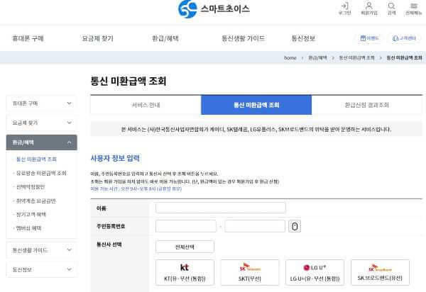 - SKT : SKT의 경우, SKT 환급금 조회 페이지에 접속하여 필요한 정보를 입력하면 됩니다.